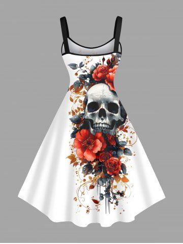 Plus Size Skull Flower Leaf Print Halloween Costume A Line Tank Dress - White - L