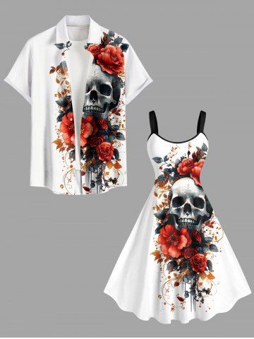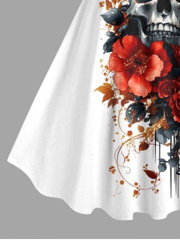 Plus Size Skull Flower Leaf Print Halloween Costume A Line Tank Dress - White - 5x