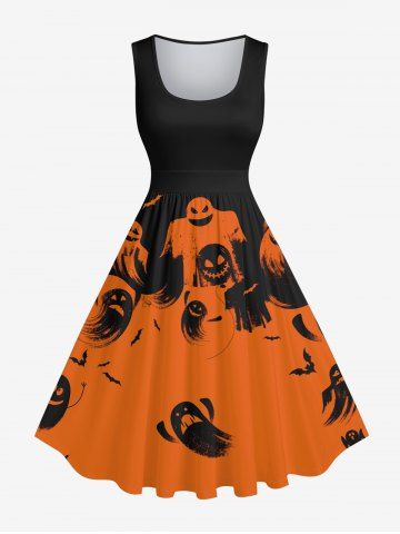 Plus Size Skull Ghost Bat Two Tone Print Halloween Costume Vintage Swing A Line Dress - Dark Orange - 4x