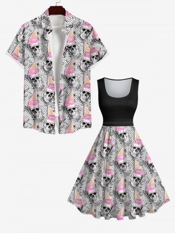 Halloween Dresses > Plus Size Skull Ice Cream Plaid Floral Print Halloween Costume Vintage Swing A Line Dress