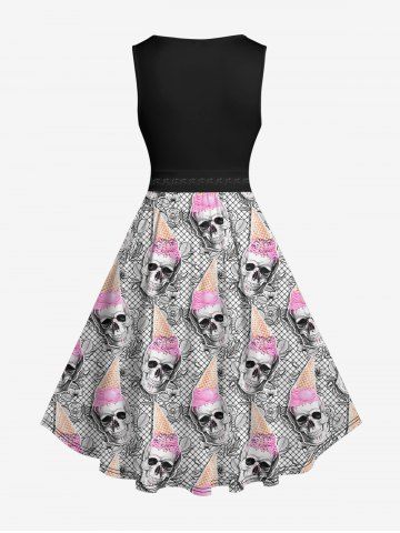 Halloween Dresses > Plus Size Skull Ice Cream Plaid Floral Print Halloween Costume Vintage Swing A Line Dress