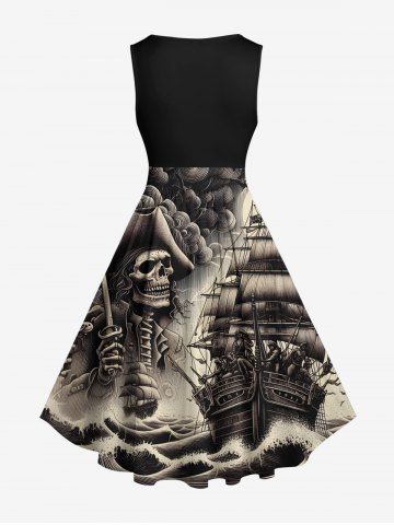Plus Size Skull Pirate Sea Waves Ship Print 1950s Vintage Dress - Black - M