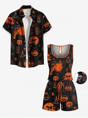 Plus Size Skull Pumpkin Tombstone Print Halloween Drawstring Pocket Romper - Black - S