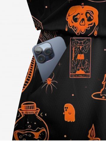 Halloween Dresses > Plus Size Skull Pumpkin Tombstone Print Halloween Drawstring Pocket Romper