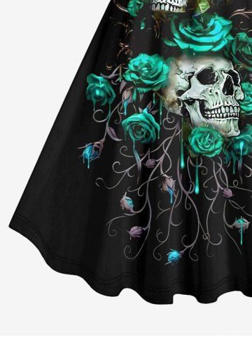 Plus Size Skull Rose Flower Branch Print Halloween Costume A Line Tank Dress - Black - 1x