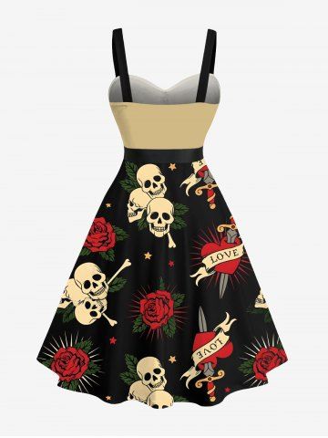 Halloween Dresses > Plus Size Skull Rose Flower Heart Print Halloween Costume Button A Line Dress with Removable Belt