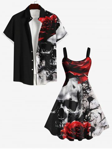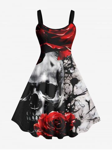 Plus Size Skull Rose Flower Ink Painting Print Halloween Costume A Line Tank Dress - Black - L
