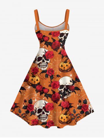 Plus Size Skull Rose Flower Leaf Pumpkin Print Halloween A Line Tank Dress - Orange - S