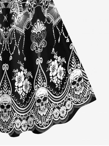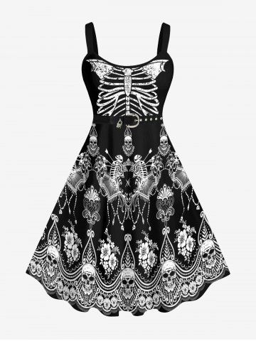 Plus Size Skull Skeleton Flower Print Tank Dress - Black - S