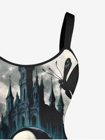 Plus Size Skull Skeleton Rose Flower Moon Butterfly Castle Print Halloween A Line Dress - Black - 3x
