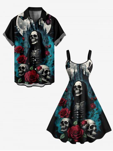 Plus Size Skull Skeleton Rose Flower Moon Butterfly Castle Print Halloween A Line Dress - Black - 4x