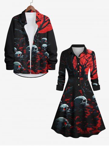 Halloween Dresses > Plus Size Skull Tree Branch Hell Print Halloween Costume Half Button A Line Shirted Dress