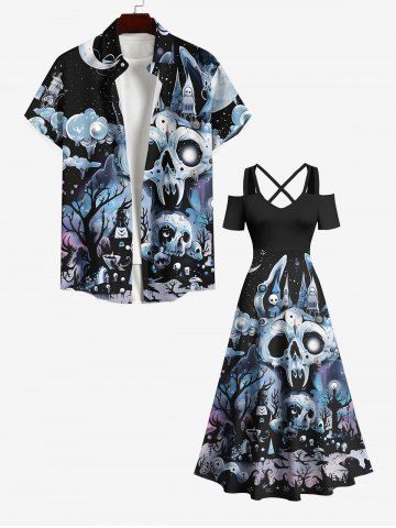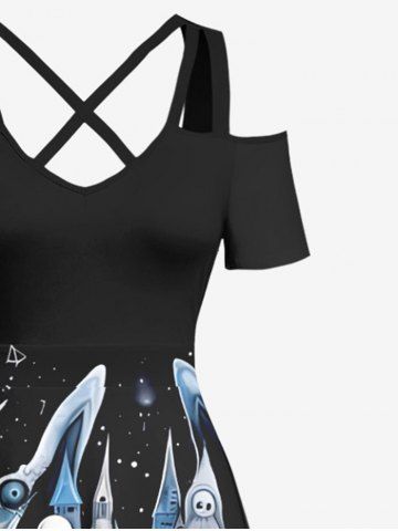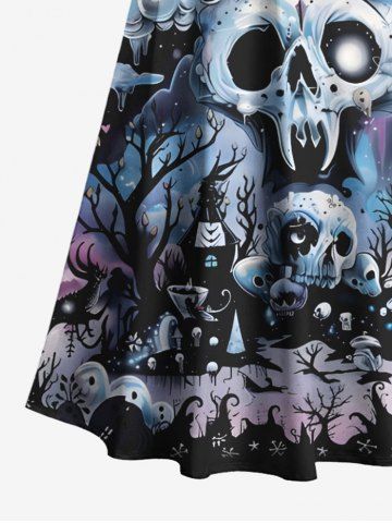 Plus Size Skull Tree Castle Moon Cloud Galaxy Print Halloween Costume Crisscross A Line Maxi Dress - Black - 5x