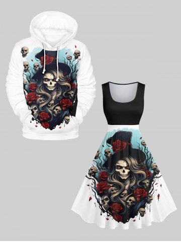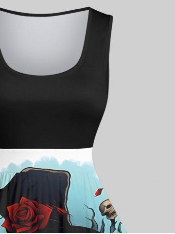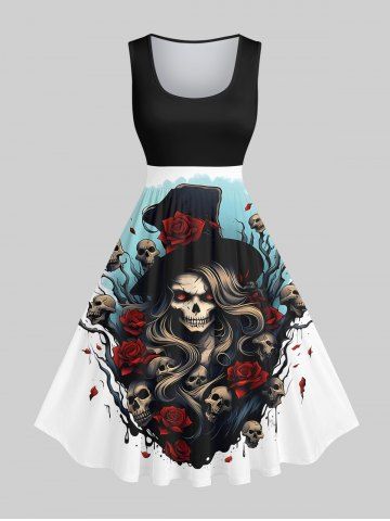 Plus Size Skull Wizard Rose Flower Tree Print Halloween Costume Vintage Swing A Line Dress - Black - S
