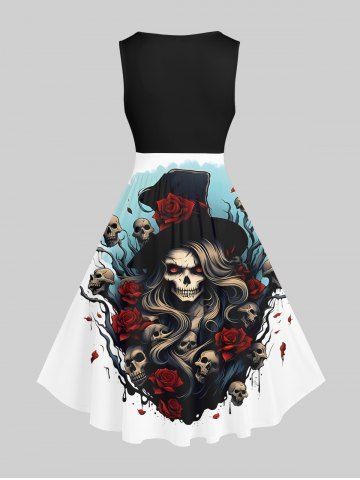 Plus Size Skull Wizard Rose Flower Tree Print Halloween Costume Vintage Swing A Line Dress - Black - L