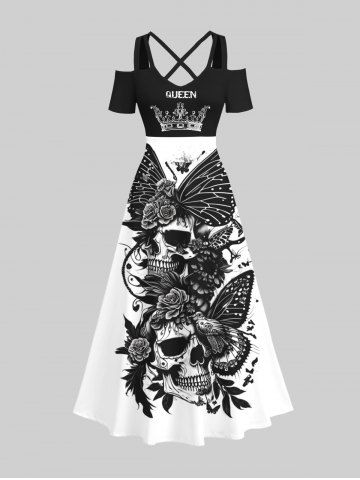 Plus Size Skulls Floral Butterfly Crown Print Halloween Costume Crisscross A Line Maxi Dress - Multi-a - M