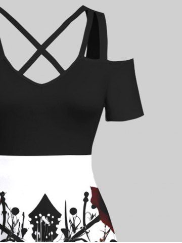 Plus Size Skulls Flower Leaf Heart Guitar Ink Painting Print Halloween Costume Crisscross A Line Maxi Dress - Black - L