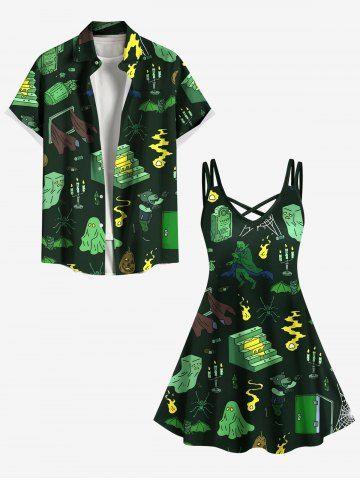 Plus Size Spider Pumpkin Ghost Bat Candle Print Halloween Crisscross A Line Cami Dress - Green - L