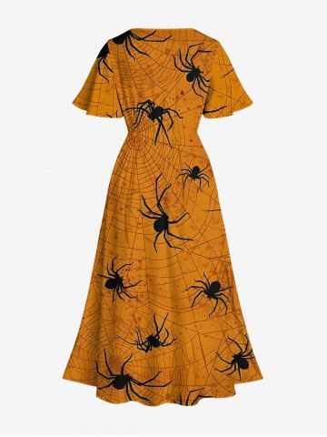 Plus Size Spider Web Insect Print Halloween Split Pocket A Line Midi Dress - Orange - S