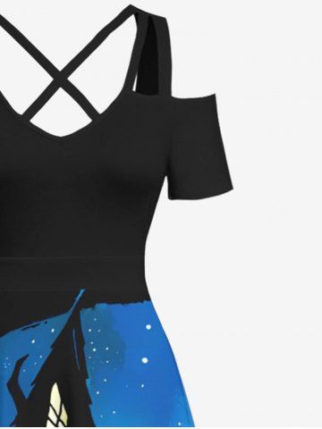 Plus Size Spiral Tree Castle Galaxy Moon Print Halloween Costume Crisscross A Line Maxi Dress - Black - 3x