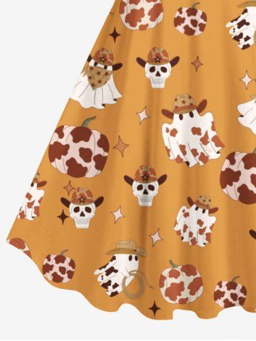 Plus Size Spotted Pumpkin Skull Hat Ghost Stars Print Halloween Costume A Line Tank Dress - Orange - 5x