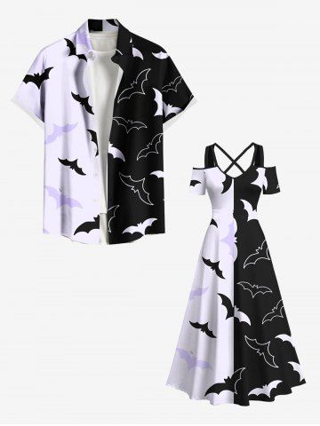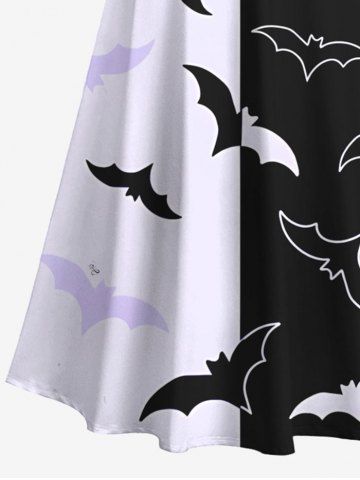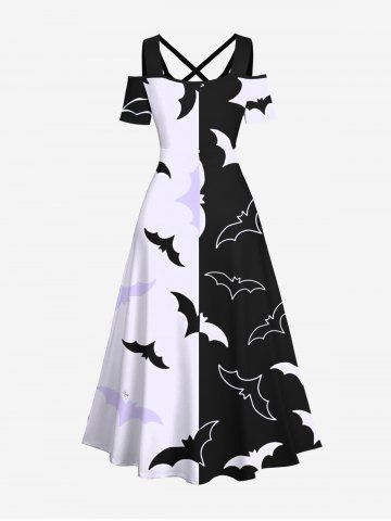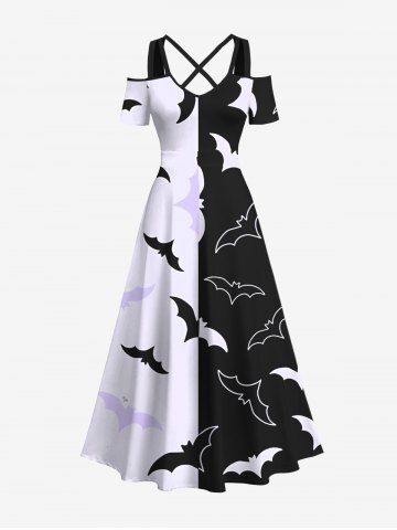 Halloween Dresses > Plus Size Two Tone Bat Print Halloween Cold Shoulder Crisscross A Line Maxi Dress