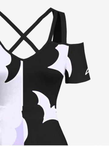 Plus Size Two Tone Bat Print Halloween Cold Shoulder Crisscross A Line Maxi Dress - Black - M