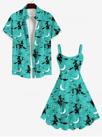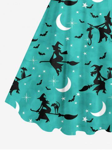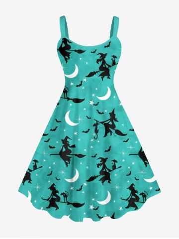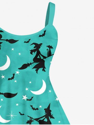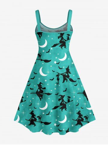 Plus Size Wizard Broom Bat Cat Moon Star Galaxy Print Halloween Costume A Line Tank Dress - Light Green - 4x