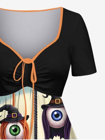 Plus Size Wizard Eye Tree Pumpkin Moon Print Halloween Cinched A Line Dress - Black - 6x