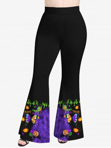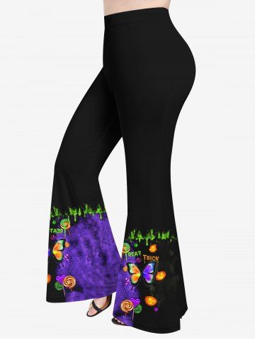 Plus Size 3D Butterfly Candy Pumpkin Colorblock Print Halloween Flare Pants - Black - 1x