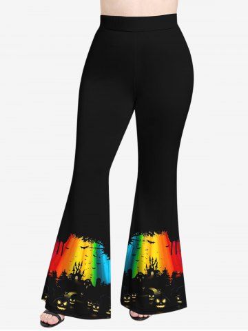 Plus Size Colorful Rainbow Light Beam Pumpkin Lantern Print Halloween Flare Pants - Black - 3x