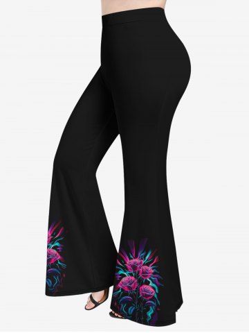 Plus Size Colorful Rose Flower Leaf Ribbon Print Halloween Flare Pants - Black - 4x