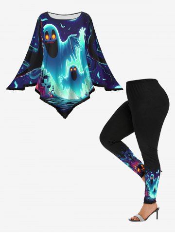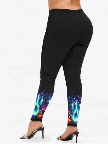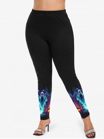 Plus Size Halloween Costume Ghost Trees Bat Moon Print Leggings - Black - 3x