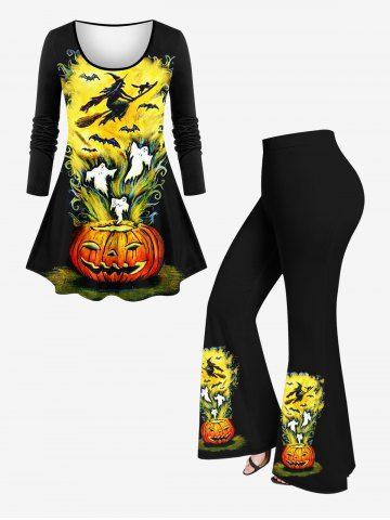 Plus Size Halloween Costume Pumpkin Fire Flame Ghost Bat Wizard Print Flare Pants - Black - 6x