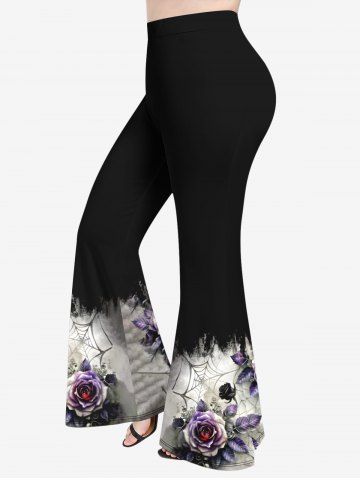 Plus Size Halloween Costume Rose Flower Leaf Spider Web Print Flare Pants - Black - 1x