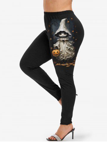 Plus Size Halloween Cute Ghost Pumpkin Leaf Print Leggings - Black - Xs