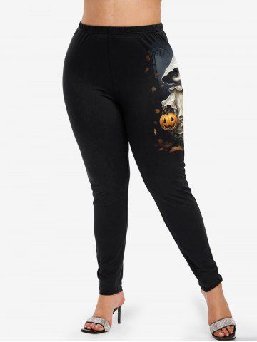 Plus Size Halloween Cute Ghost Pumpkin Leaf Print Leggings - Black - 6x