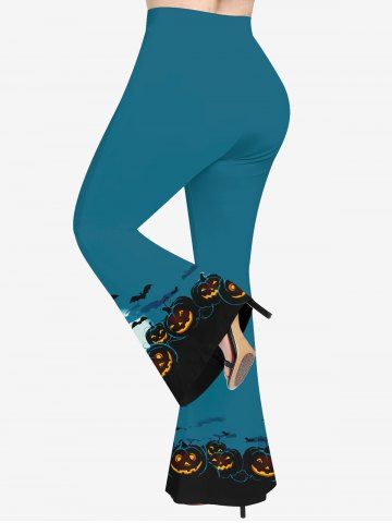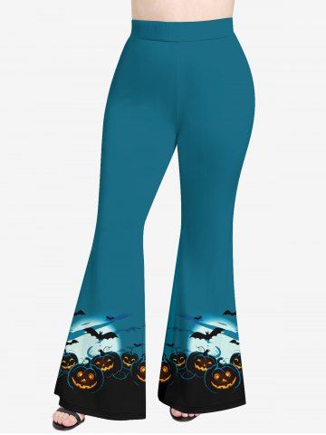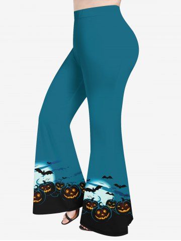 Plus Size Halloween Moon Bat Pumpkin Print Flare Pants - Blue - 5x