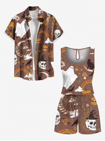 Plus Size Halloween Pumpkin Ghost Skull Flowers Mushroom Print Cinched Romper - Light Brown - 2x