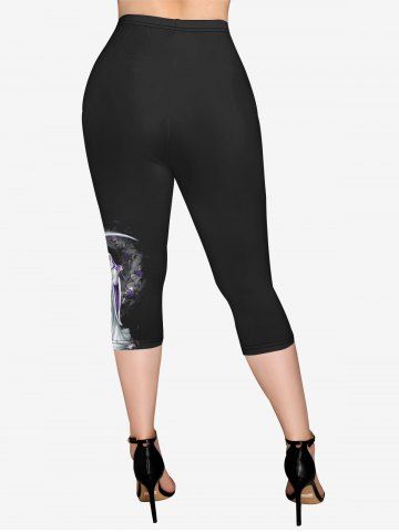 Halloween Plus Size Witch Skull Flower Print Pockets Capri Leggings - Black - S
