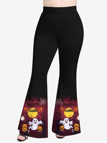 Plus Size Moon Bat Ghost Spider Web Pumpkin Tree Print Halloween Flare Pants - Deep Red - 3x