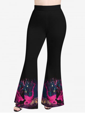 Plus Size Wizard Cat Tree Fire Flame Print Halloween Flare Pants - Black - M