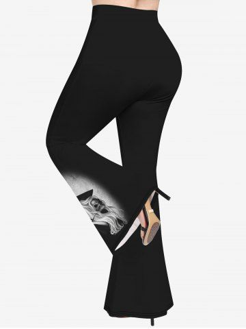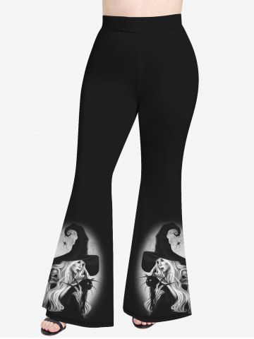 Halloween Plus Size Wizard Spider Cat Skull Print Flare Pants - Black - 4x