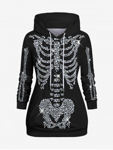 Plus Size 3D Glitter Sparkling Skeleton Print Halloween Kangaroo Pocket Drawstring Hoodie - Black - 6xl