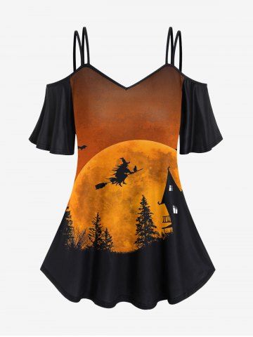 Gothic Moon Tree House Wizard Bat Print Cold Shoulder Halloween Cami T-shirt - Black - 4x