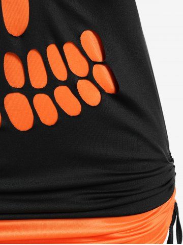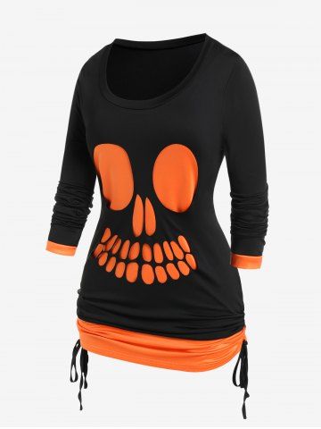 d*****b5Halloween Cutout Skull Pattern Cinched Ruched Colorblock Twofer TeeColor: BLACK Size: 2X | US 18-20love the jumper top non detachable orange top inside, soft and comfy ideal for lounge day or dressing up for Halloween