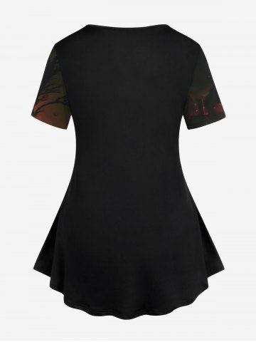 Plus Size Bat Castle Wizard Cross Pumpkin Printed Halloween Women T-shirt - Black - 1x