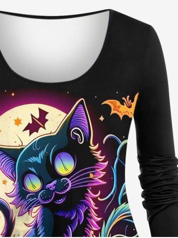 Plus Size Colorful Glitter Ombre Pumpkin Cat Bat Leaf Moon Print Halloween Long Sleeves T-shirt - Black - 1x