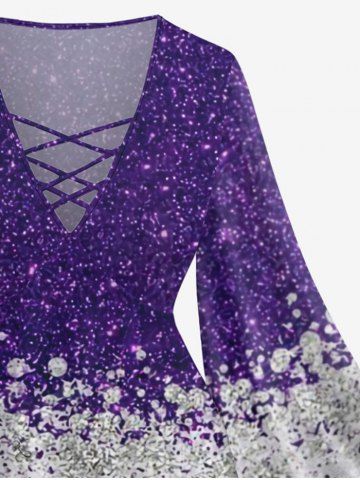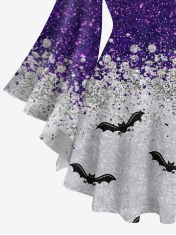 Plus Size Flare Sleeves Glitter Sparkling Galaxy Sequins Bat Print Halloween Lattice T-shirt - Purple - Xs
