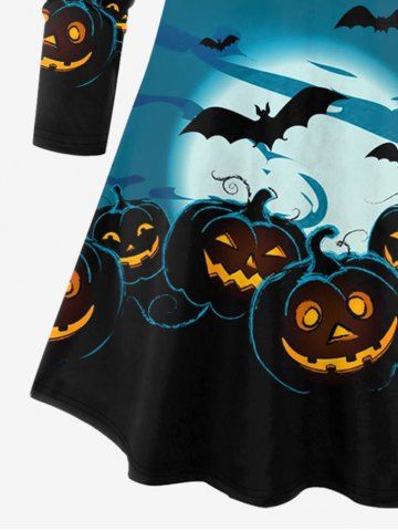 Plus Size Halloween Colorblock Pumpkin Bat Moon Print T-shirt - Blue - S